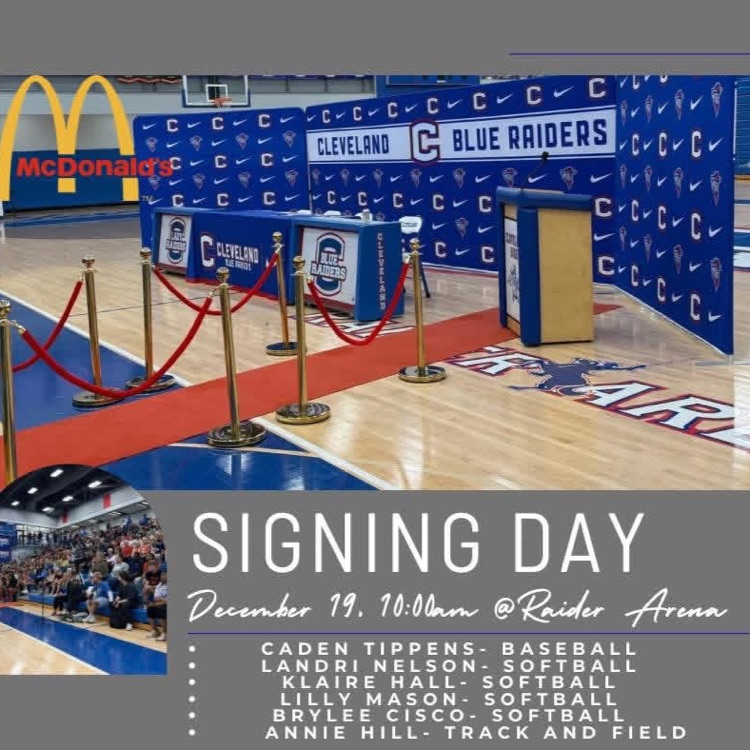 Join us on Friday, December 19 at 10:00 a.m. in Raider Arena as we celebrate our student athletes who have earned the opportunity to compete at the next level. This is a big moment for them, their families, and our entire Cleveland High School community.