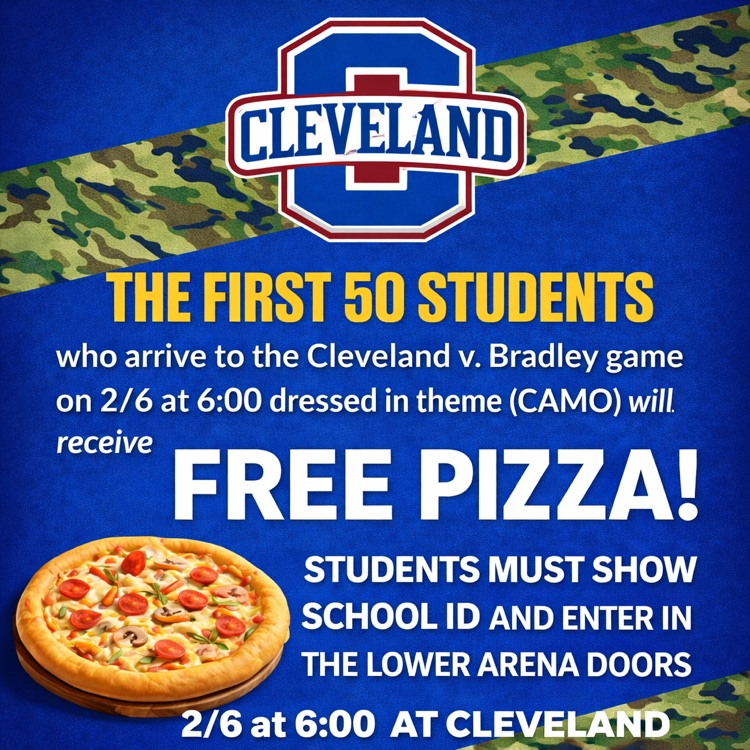 The first 50 students who arrive dressed in CAMO to the Cleveland vs. Bradley basketball game tomorrow, 2/6 at 6:00 PM will receive FREE PIZZA!