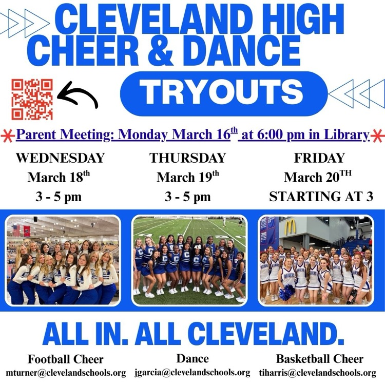 Cheer โ Coach Harris (tiharris@clevelandschools.org) or Megan Carroll (mturner@clevelandschools.org)