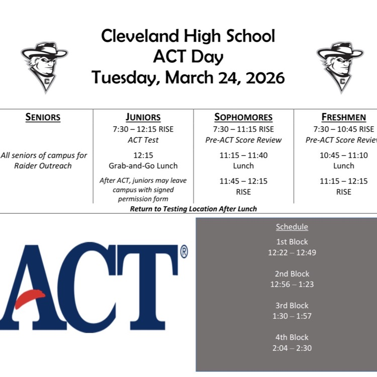 Tomorrow is ACT day! Rest up, be confident, and rock the test! Here is the schedule we will follow.
